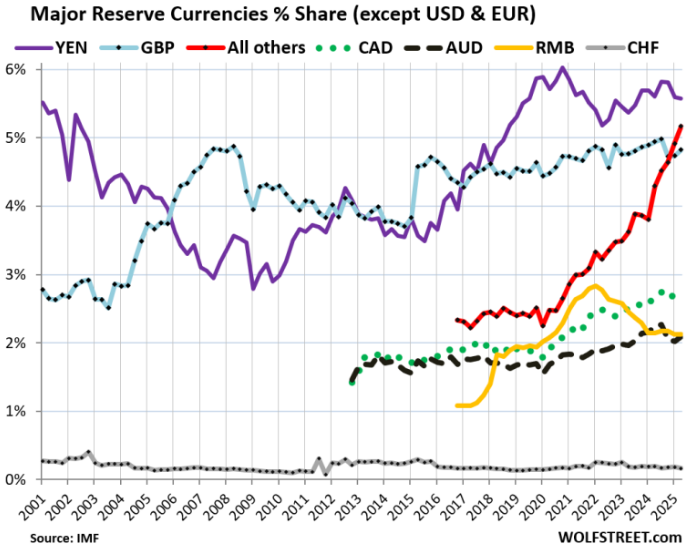 Opvallend is de opkomst van “niet-traditionele reservemunten”, zoals de IMF ze noemt. Deze kleinere munten winnen gestaag aan populariteit bij centrale banken, ten koste van de dollar én de Chinese renminbi. De groei van de RMB wordt beperkt door kapitaalrestricties en een gebrek aan volle convertibiliteit.