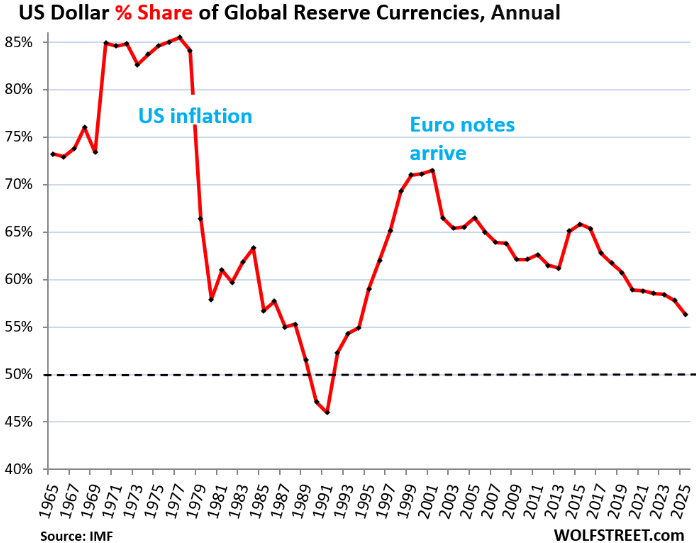 De Amerikaanse dollar heeft opnieuw terrein verloren als wereldwijde reservemunt. In het tweede kwartaal van 2025 daalde het aandeel van dollar-gebaseerde activa in de wereldwijde reserves naar 56,3%, het laagste niveau sinds 1994.