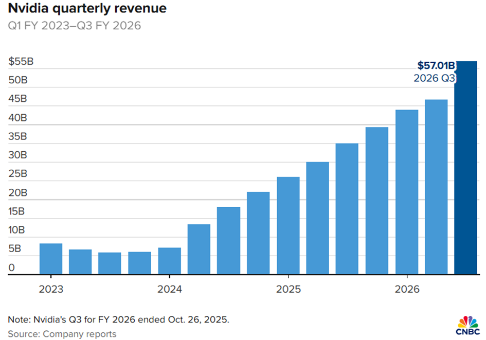 De kwartaalcijfers van Nvidia waren opnieuw indrukwekkend en bevestigen de dominantie van de chipmaker in de AI‑sector. De sterke omzetgroei en winstcijfers onderstrepen hoe groot de rol van technologiebedrijven is in de huidige beursindices. Toch laat de bredere economie een heel ander beeld zien.